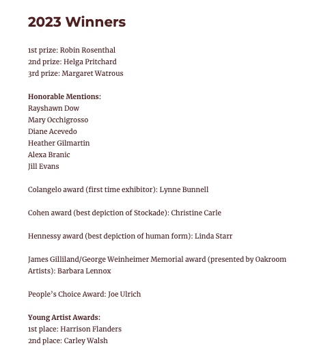 . . TRAGEDY (for a website editor): (Sep 9, 2024): The opening sections of this SOAS posting, with information and photos about all the 2023 Winners and their art, plus the beginning of our STROLL of the SHOW, was accidentally deleted. There is still a lot to see below, but a lot was lost.