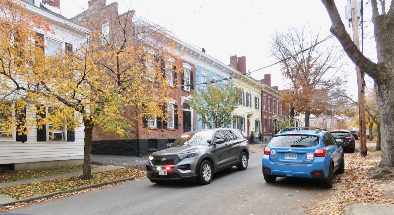 The entire corps of runners in this year’s MVP Health Care Stockadeathon passed by me in just under ten minutes on the Washington Avenue block of the Stockade district, between Union and Front Streets. It was less than a mile into the 15K race. Below are the lead car with a view of the block, and the first and last groups of runners (plus, on the right, a close-up of the last dog). Click on an image for a larger version.