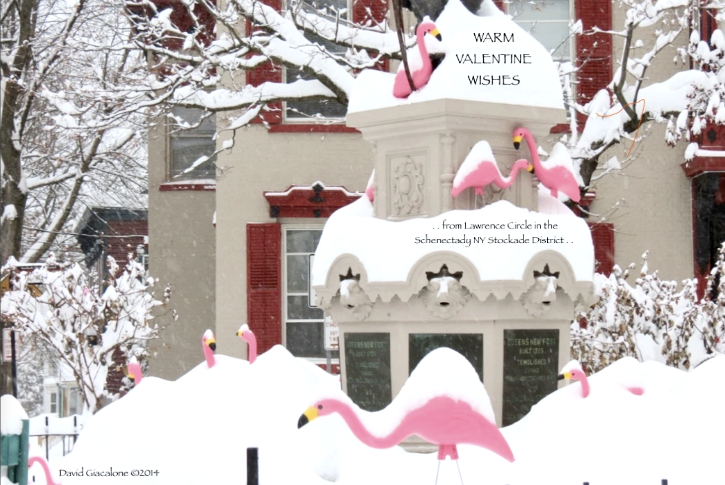 Ten years ago today, our Valentine Flamingos were greeted by a major snowstorm when they arrived at the Stockade’s Lawrence Circle. Far from producing a tragedy, the combination gave us one of the most beautiful scenes we’ve been fortunate enough to capture with photographic pixels. We celebrate a decade later by using that image to extend our most sincere Valentine wishes to all our readers: