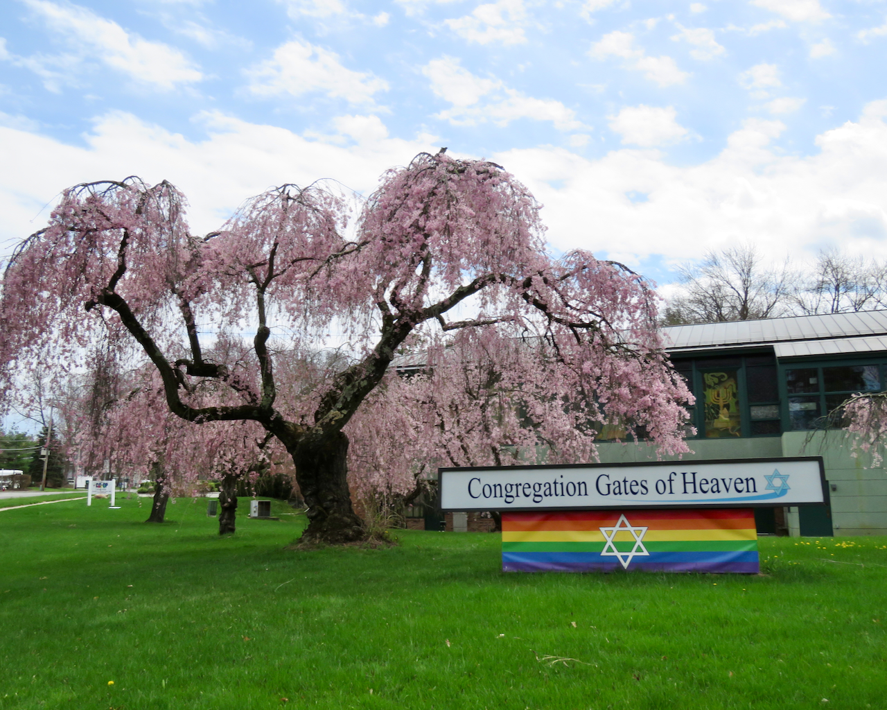 . . Compare twilight image on the Right at Congregation Gates of Heaven in 2023, with virtually budless branches, with this year’s crop on the same tree, immediately below, seen just past their peak on April 20, 2024 (for more detail, click on the image for a larger version).