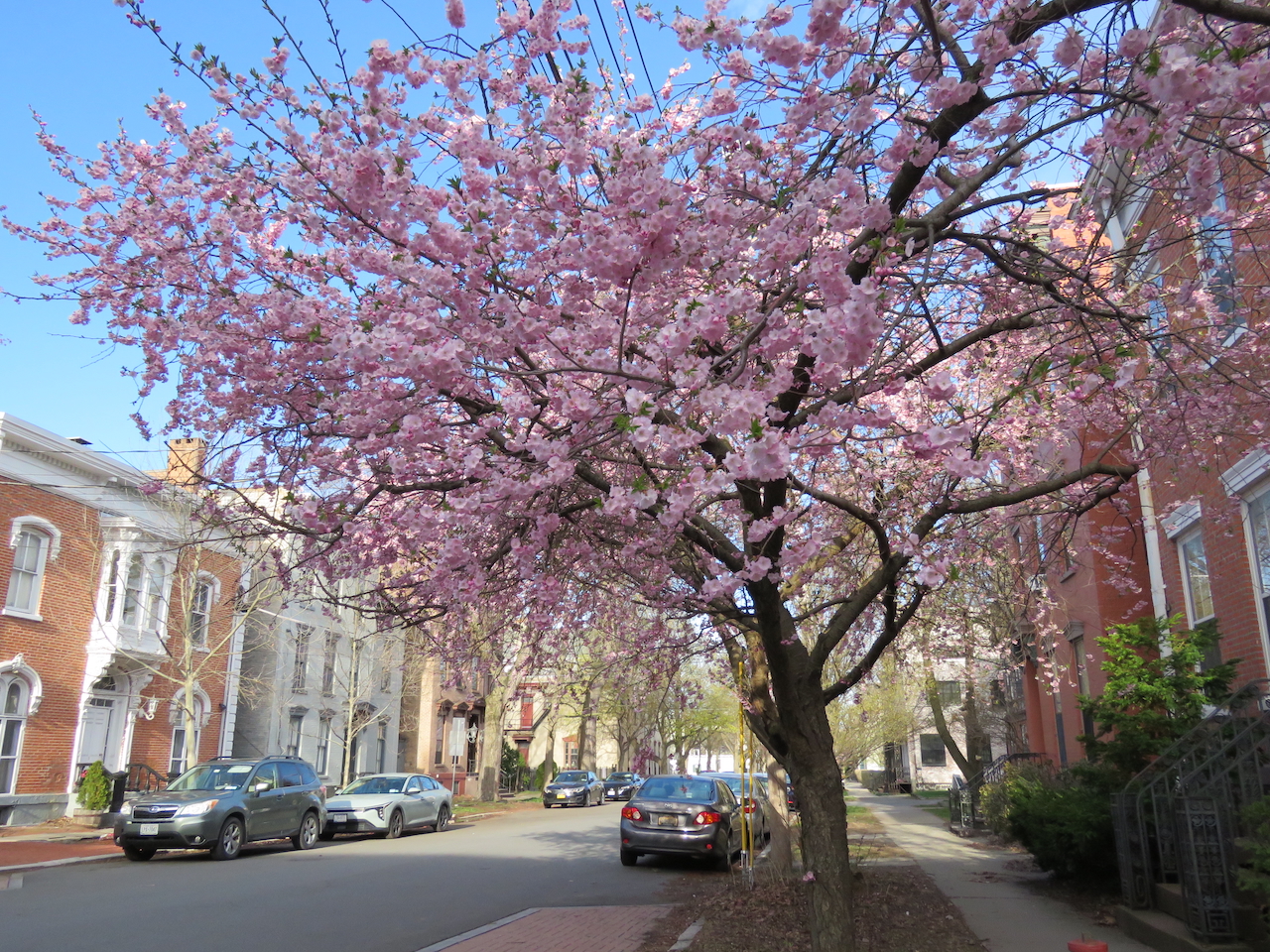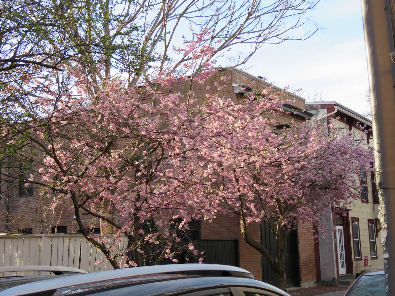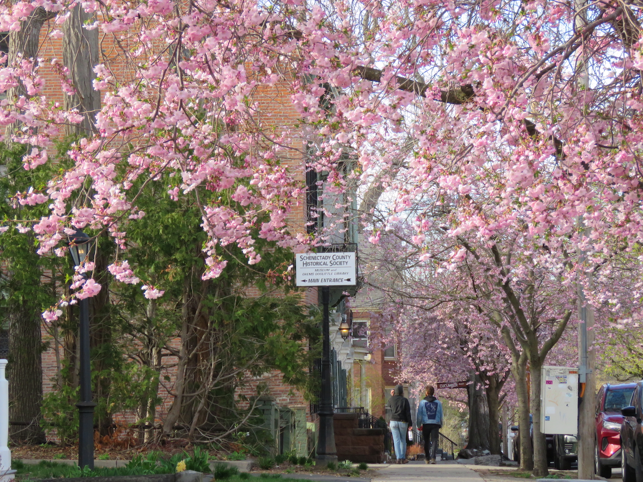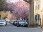 Easter sunshine gave a boost to our cherry blossom arrays in the Stockade yesterday (April 20), I am pleased to say. They may not be the most bountiful displays ever on and around my block, but they are definitely lovely and able to motivate lovers of beauty and romance, as well as cranky photographers, to come out to take a look. Magnolias were also becoming quite becoming.