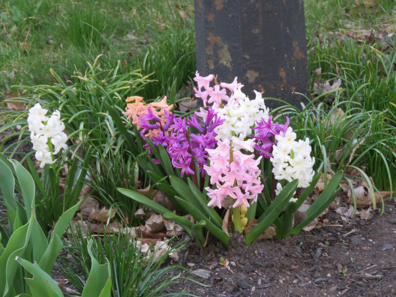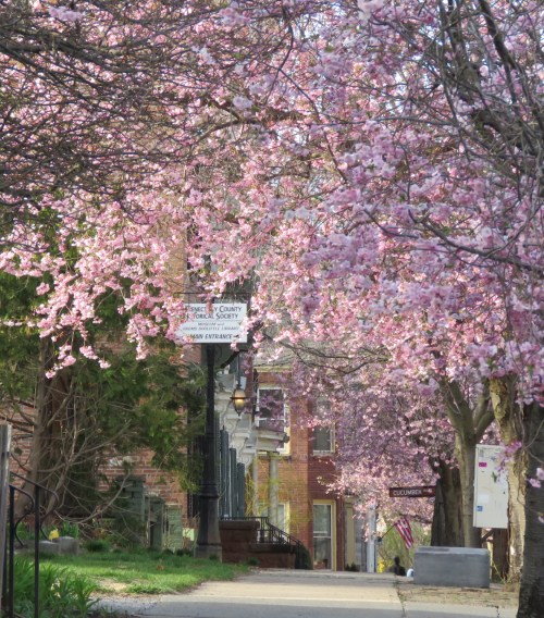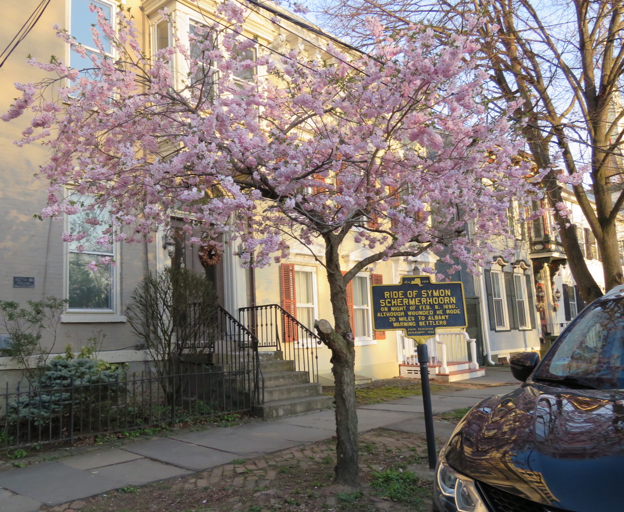 Easter sunshine gave a boost to our cherry blossom arrays in the Stockade yesterday (April 20), I am pleased to say. They may not be the most bountiful displays ever on and around my block, but they are definitely lovely and able to motivate lovers of beauty and romance, as well as cranky photographers, to come out to take a look. Magnolias were also becoming quite becoming.