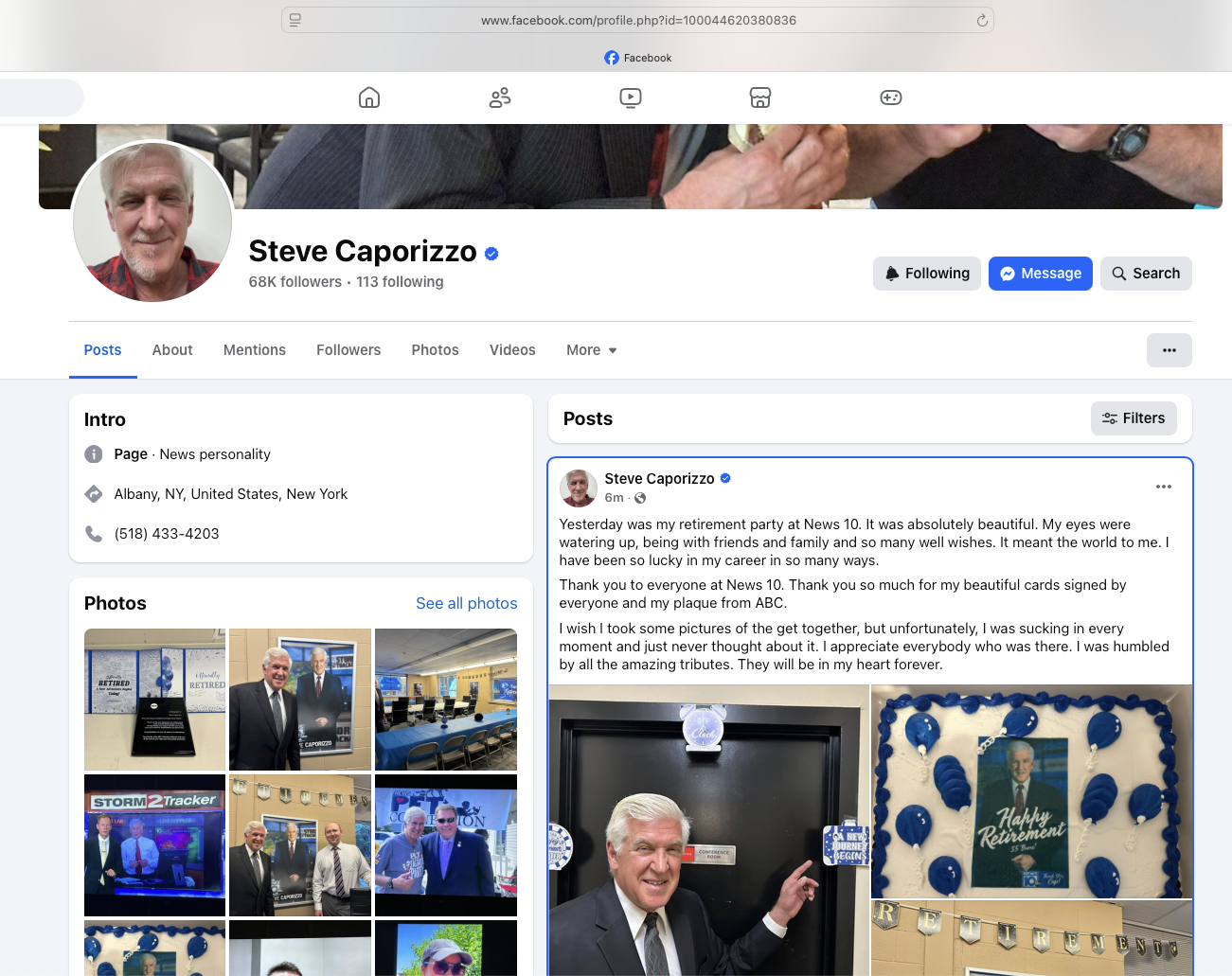 ……………….. RETIREMENT PARTY UPDATE (June 27, 2025): “Cap” just posted at his Facebook Page his reaction to the Retirement Party ABC News Channel 10 threw for him last night: “It was absolutely beautiful. My eyes were watering up, being with friends and family and so many well wishes. It meant the world to me. I have been so lucky in my career in so many ways.”