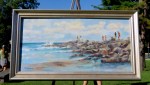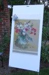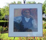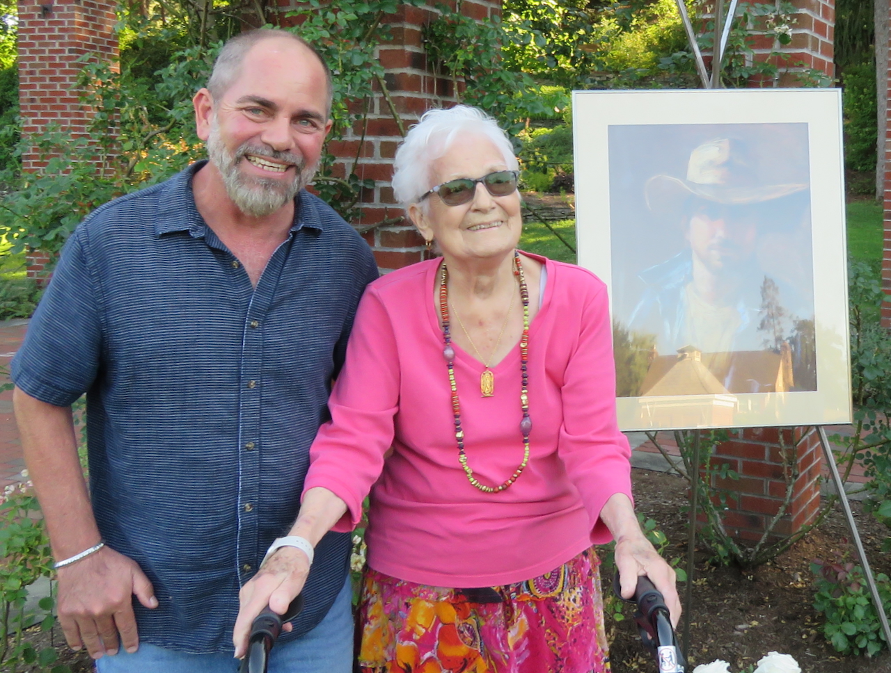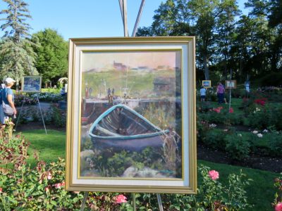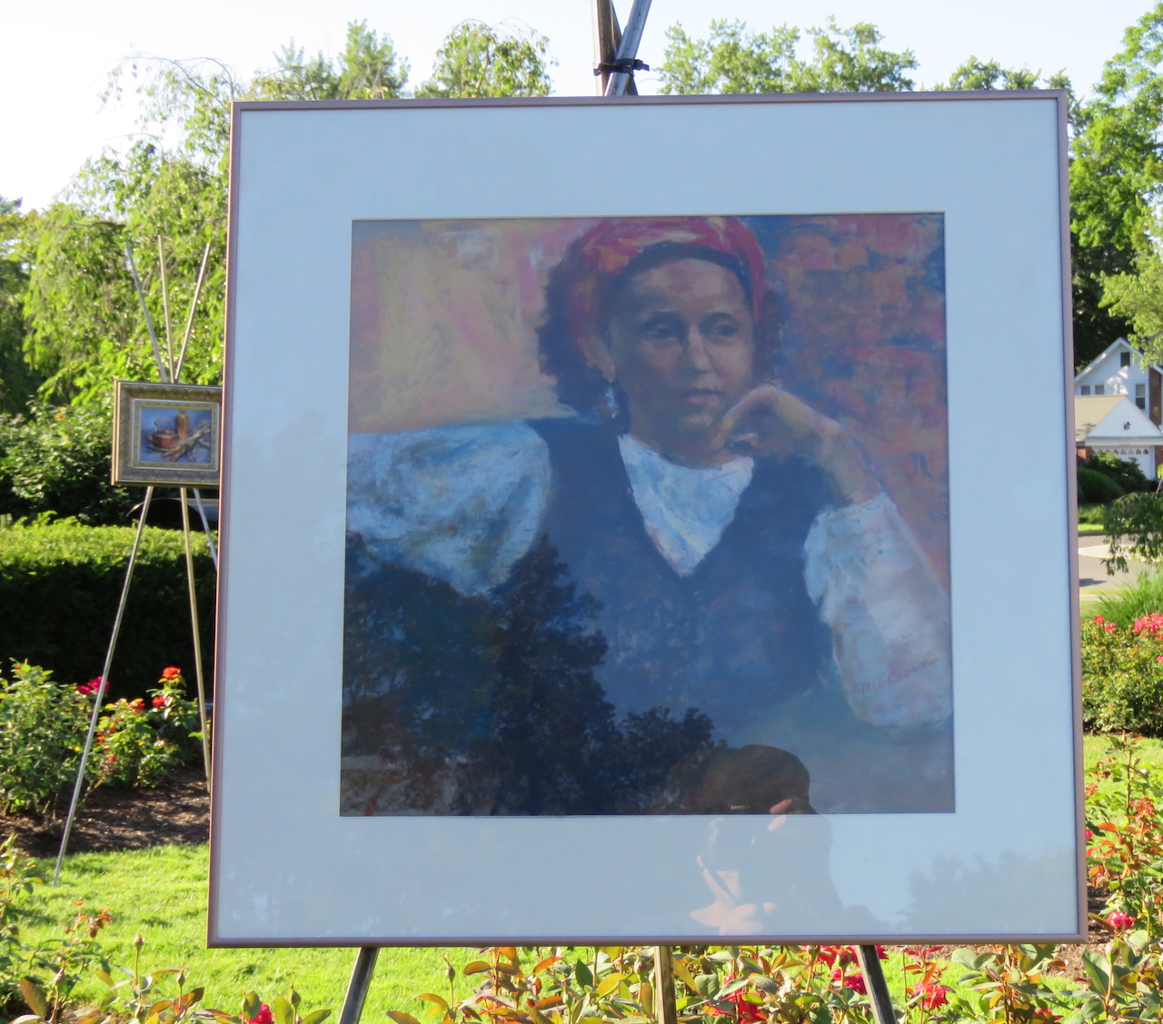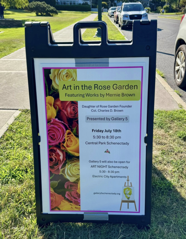 Mernie Brown (seen on the left with her son and a portrait she painted of him) is a daughter of the founder of The Schenectady Rose Garden, Col. Charles D. Brown. This evening, Friday July 18, 2025, Mernie filled the award-winning Garden with beautiful paintings, in Gallery 5 Schenectady‘s first outdoor pop-up art showcase. Her artistry and personality brought a special glow to an always special space and appreciative visitors.