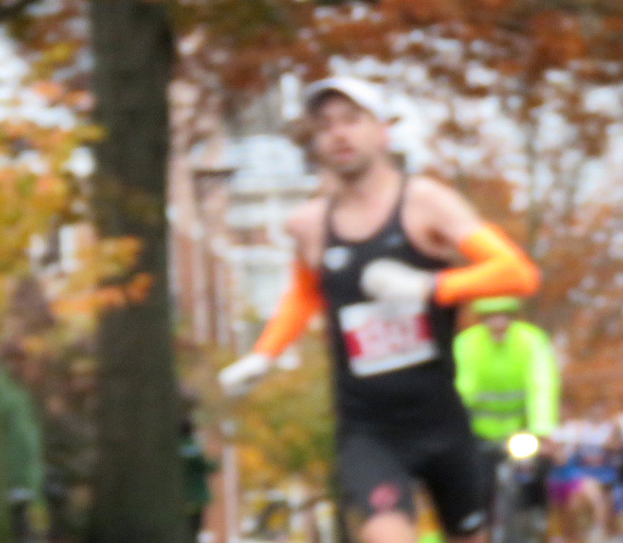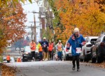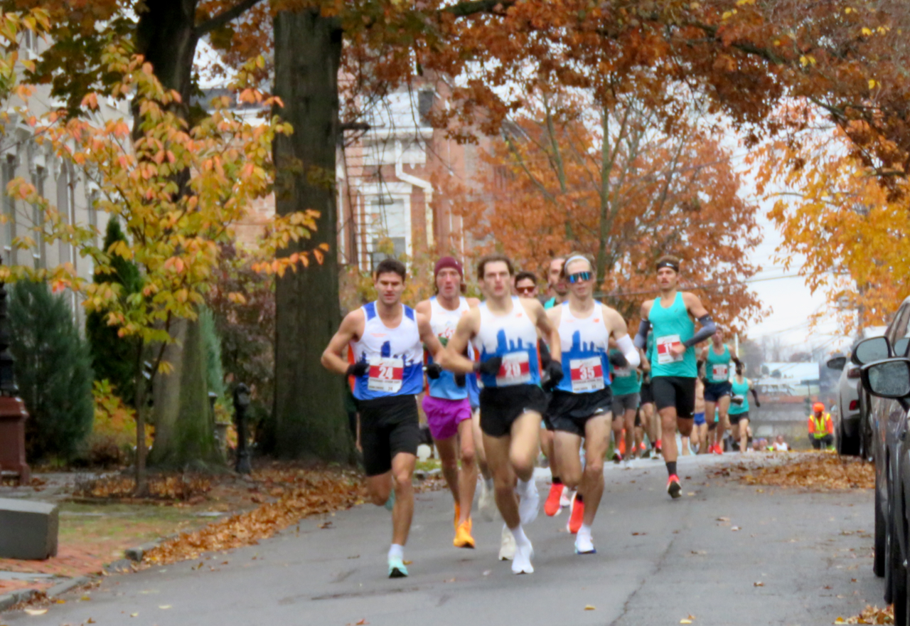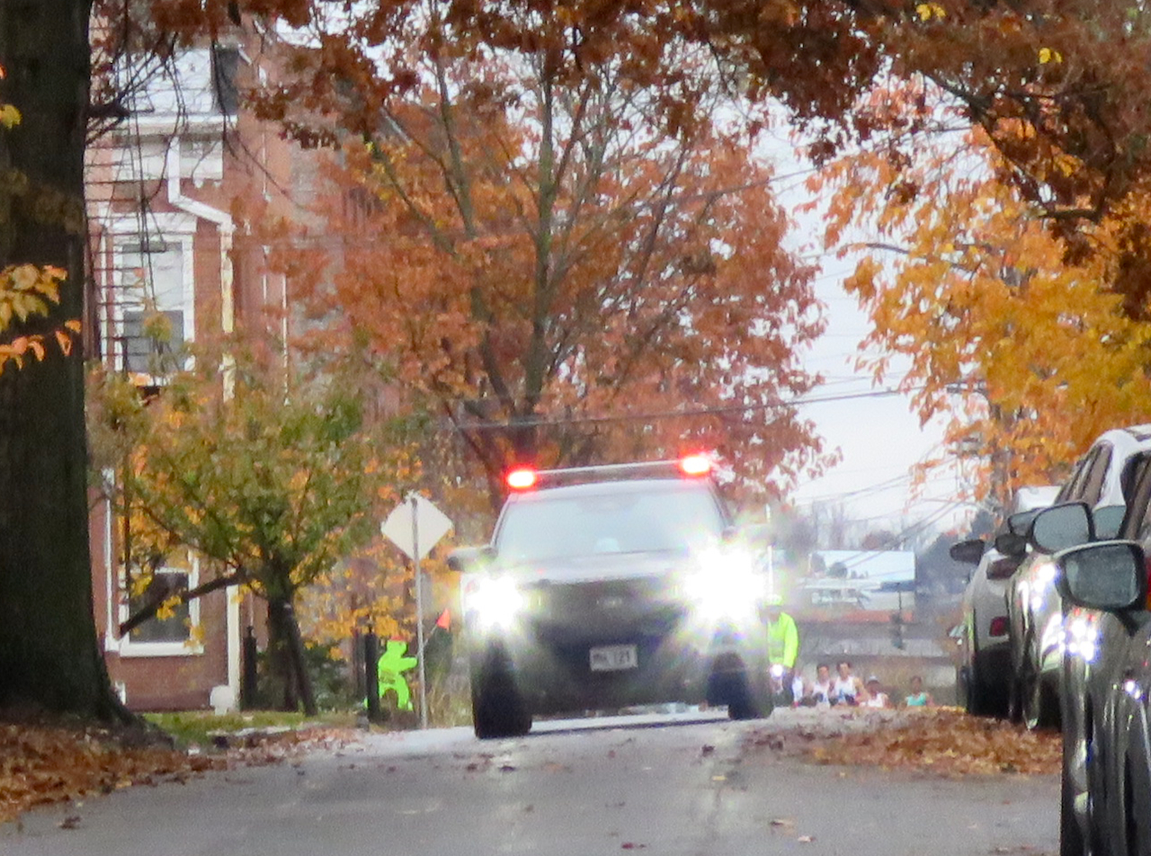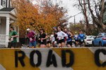 . . [L] Lead car on Washington Ave. [Below] Group of runners right behind the leader, Grant O’Connor [BIB 1347], who came by in a blur hidden a few feet behind the lead car, and finished in 1st Place.
