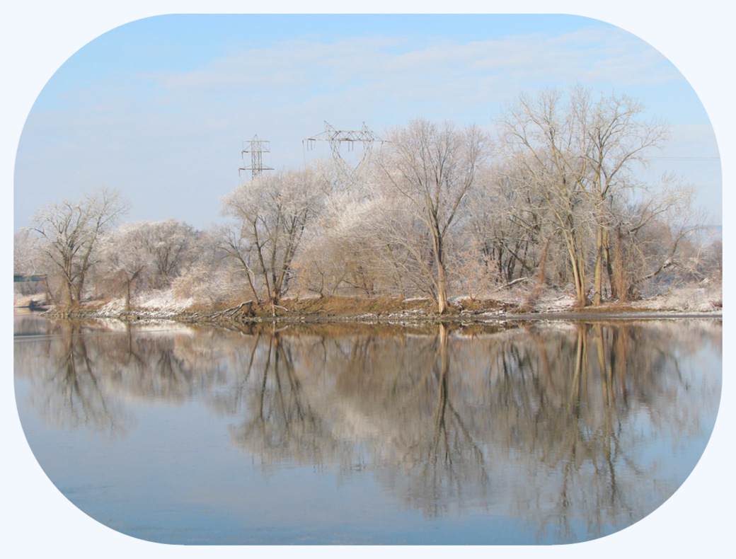 blue Mohawk River and sky with reflections from the Isle of the Cayugas as seen from Cucumber Alley in the Schenectady NY Stockade Historic District