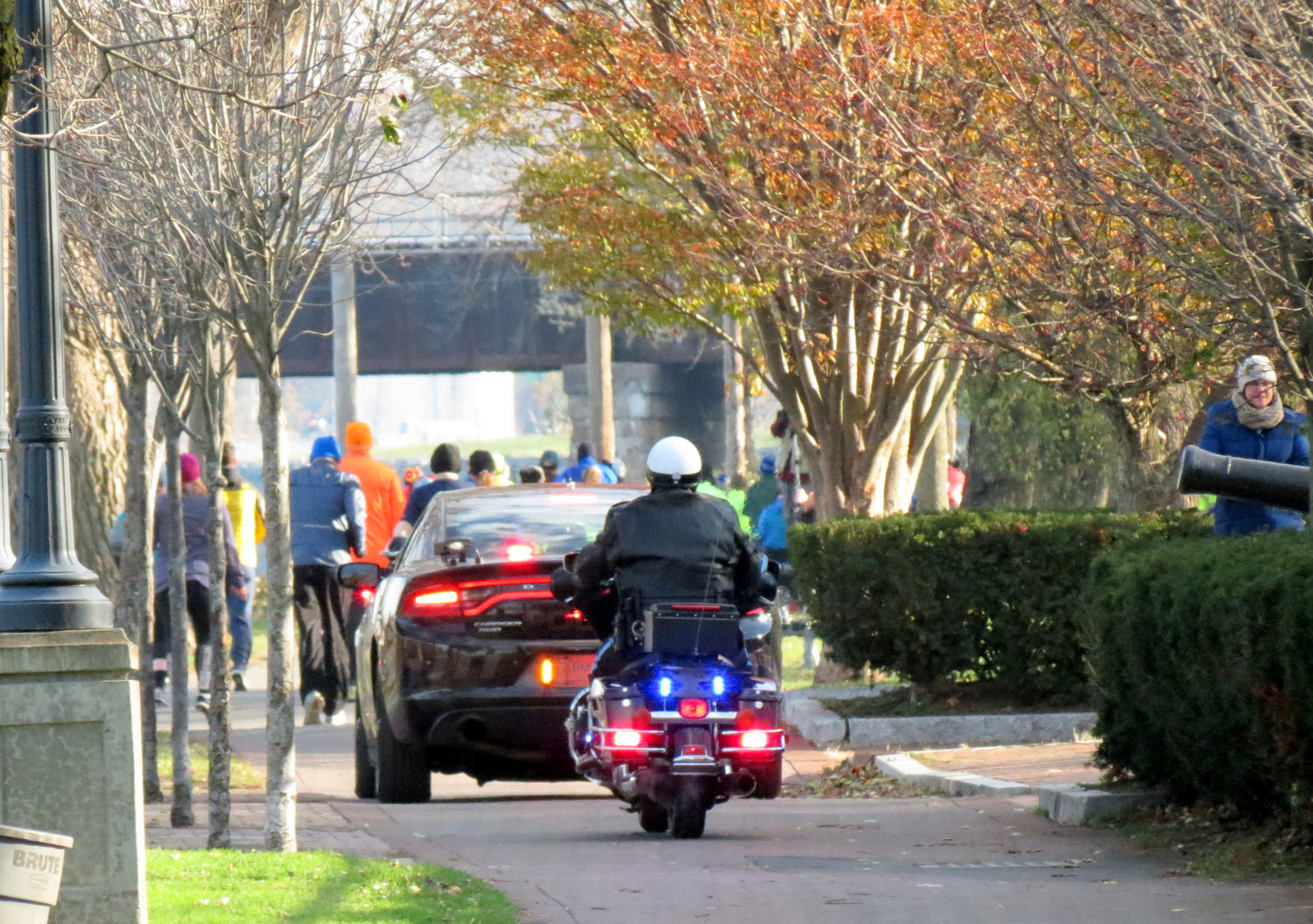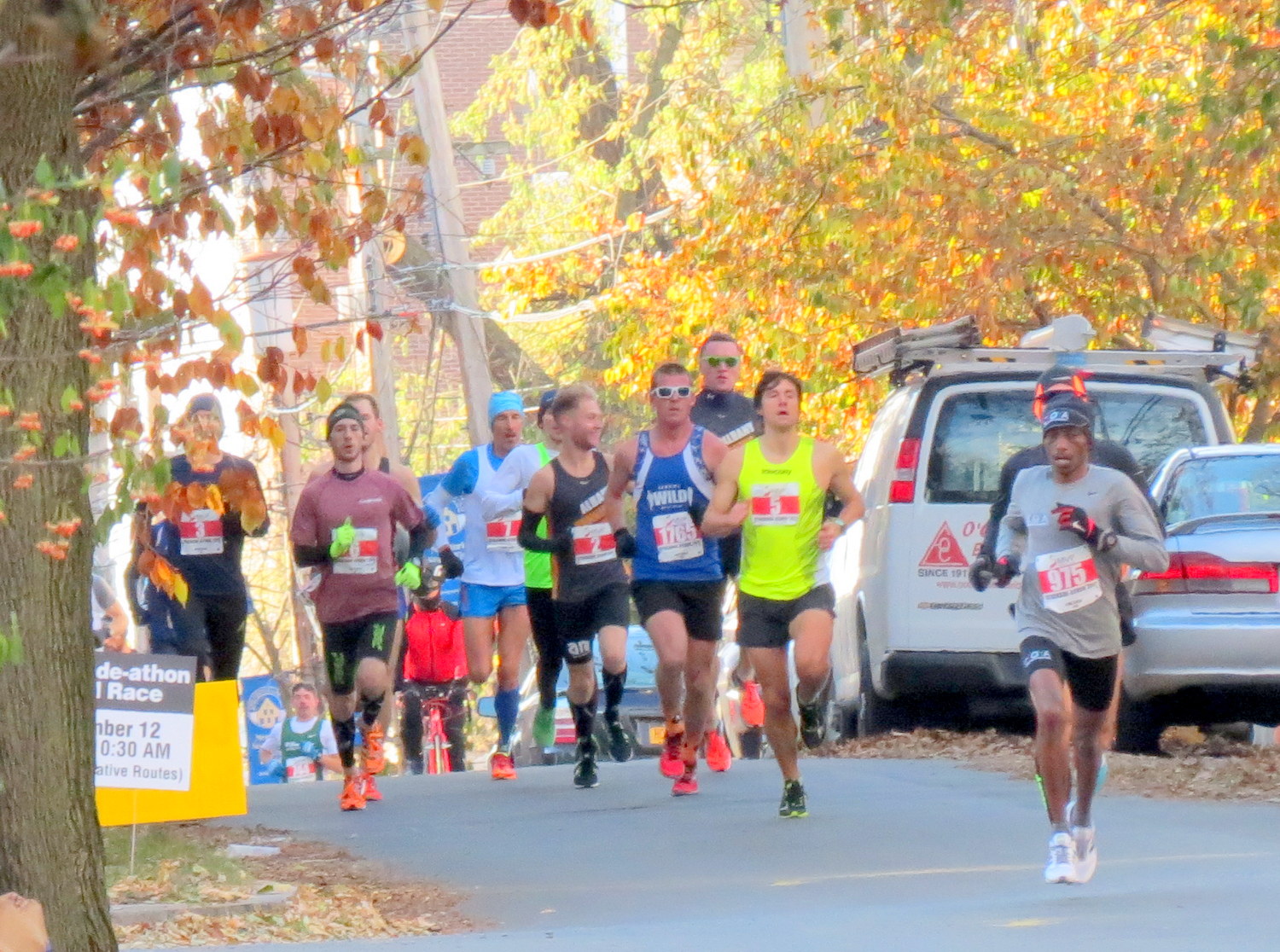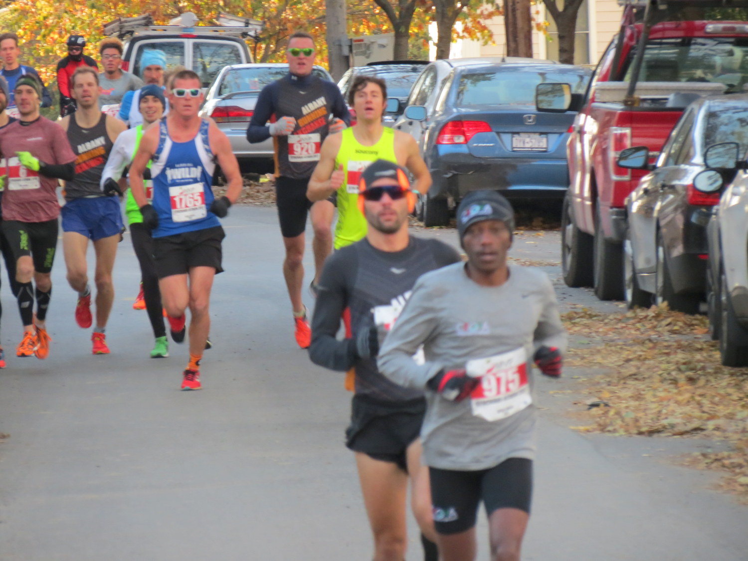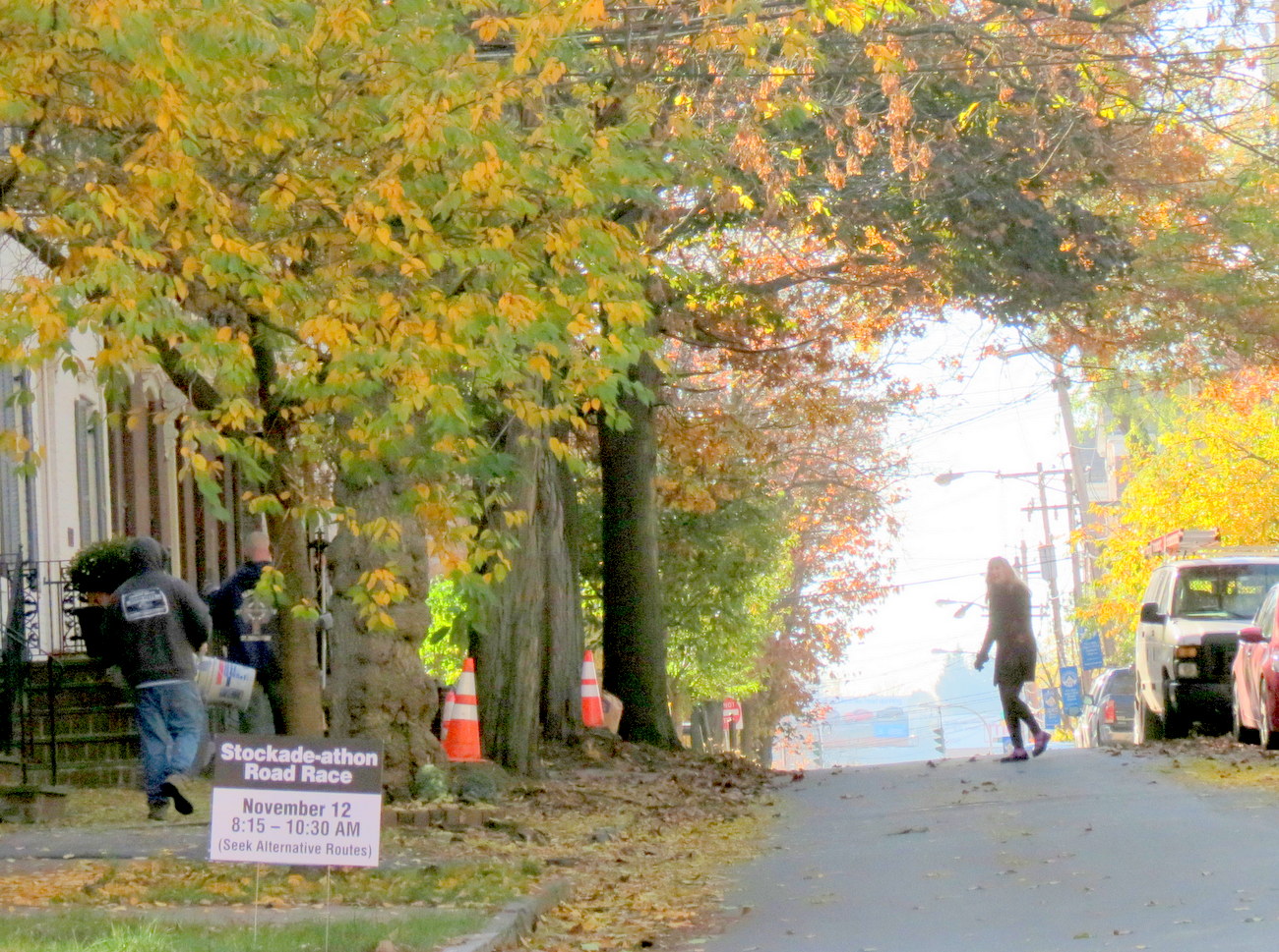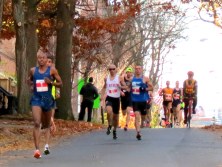 (9:30 A.M.) By late afternoon, there will be over a hundred photos in this posting, showing Stockade-athon runners coming through the Stockade and its lovely Riverside Park. As a teaser, here are a handful, showing the leaders on Washington Avenue, my first glimpse of women runners, and the end of the cohort passing the park esplanade.