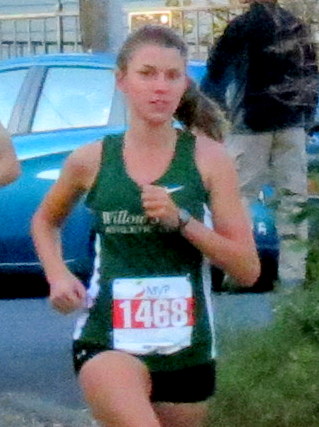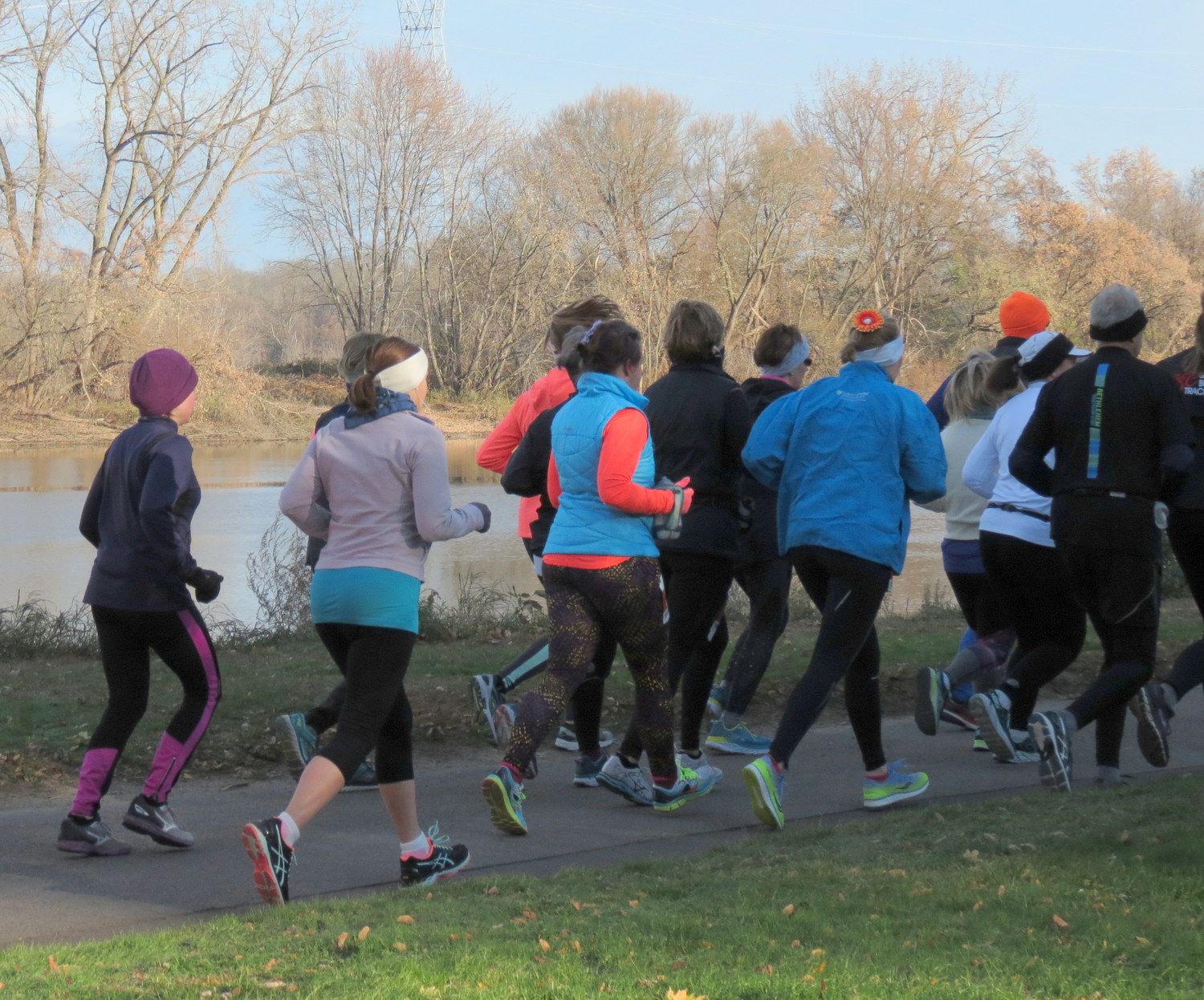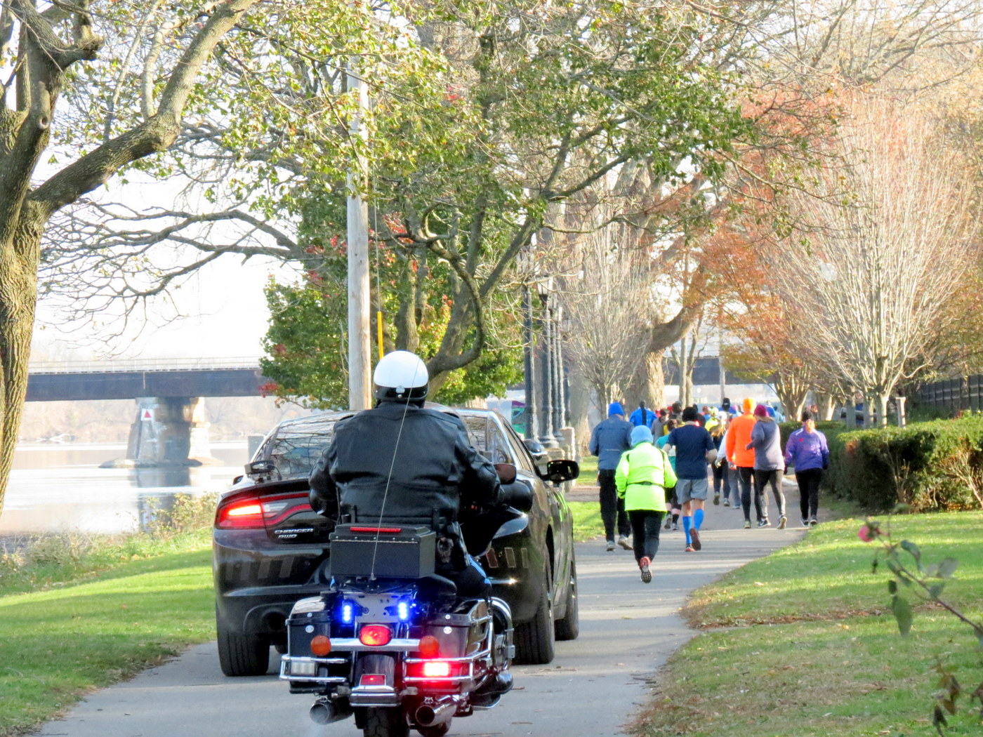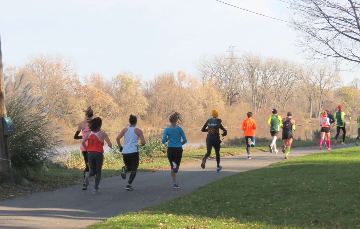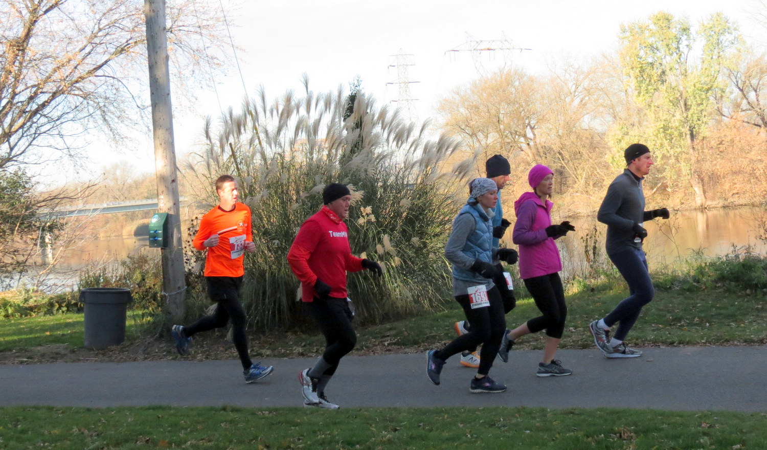 . . [L] Mollie Turner (in Black) was the first woman into Riverside Park and finished first . . Sadly, I did not turn back around soon enough to catch the leading women coming into the Park, and had to settle for capturing them after they passed me.