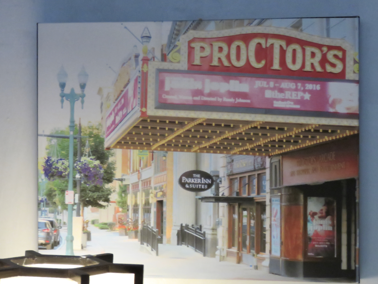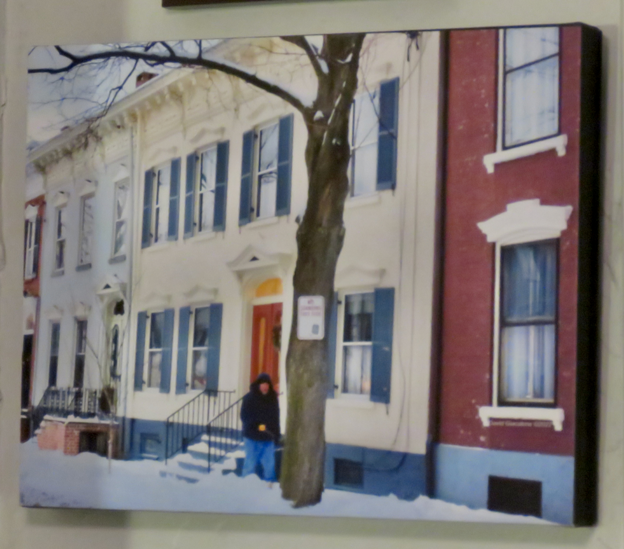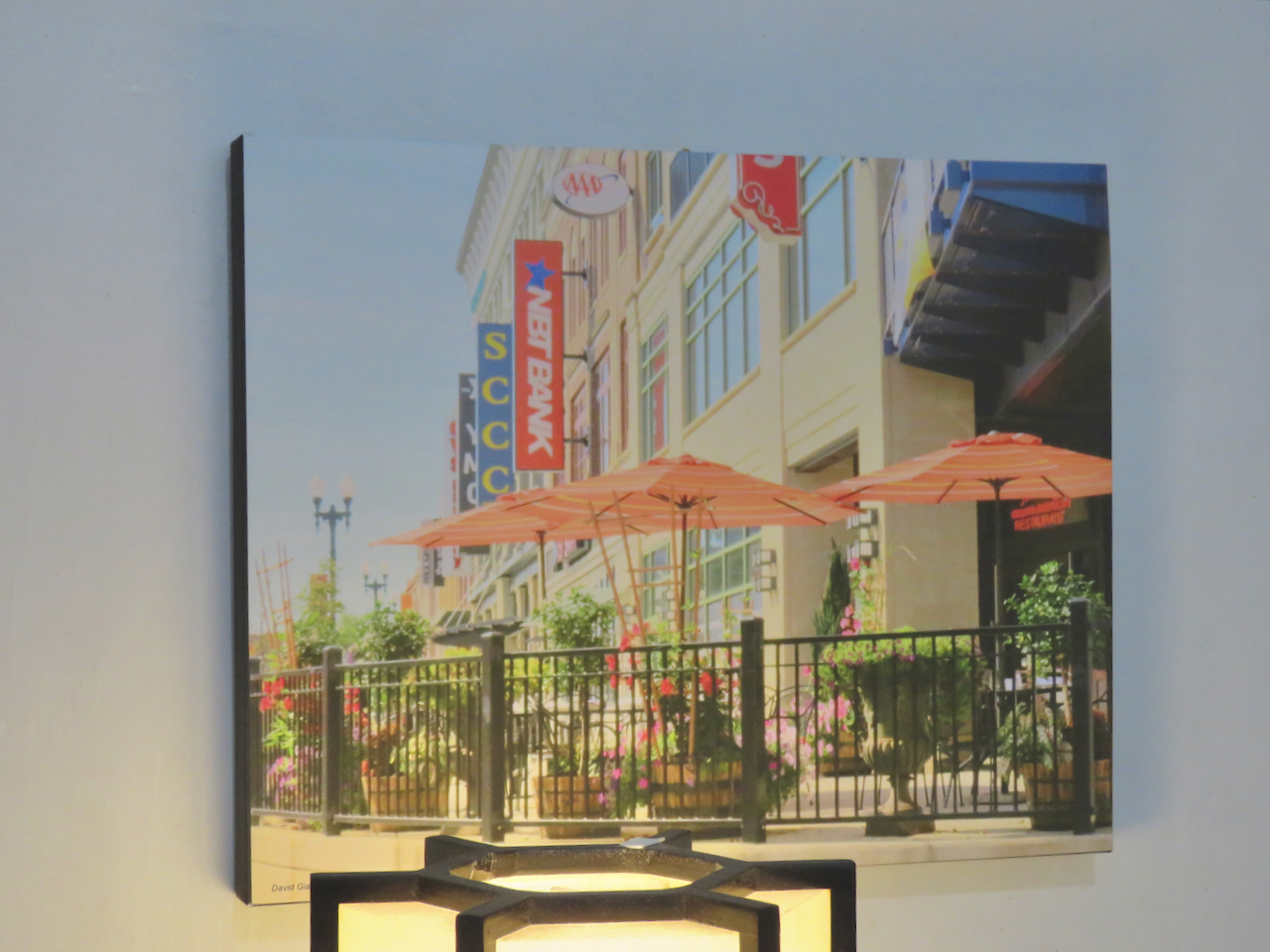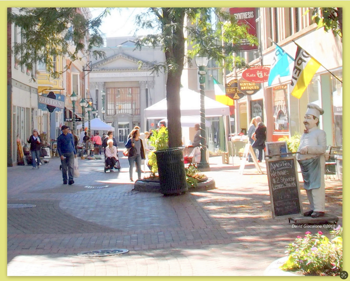 Soft sunlight made the patio at Johnny’s Restaurant and the Center City façade, State Street at Jay Street, particularly pretty in this image on canavas temporarily hung over my breakfast table: