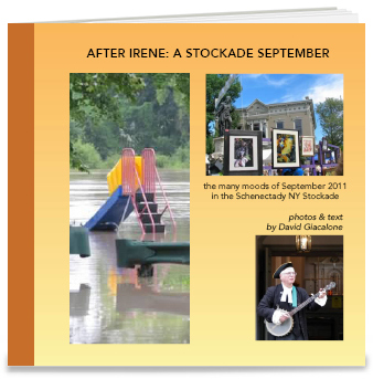 Click this link for a page-by-page preview of “After Irene, A Stockade September“: the many moods of September 2011 in the Schenectady NY Stockade“, a 32-page photobook that chronicles a particularly interesting month in the Stockade. September 2011 started with clean-up after flooding caused by the Tropical Storm phase of Hurricane Irene, followed by more flooding due to heavy rains from Tropical Storm Lee, which did not prevent the traditional Outdoor Art Show two days later; the second half of the month brought a dreamy foggy morning, and a non-traditional Walkabout day that ended in a gorgeous sunset.